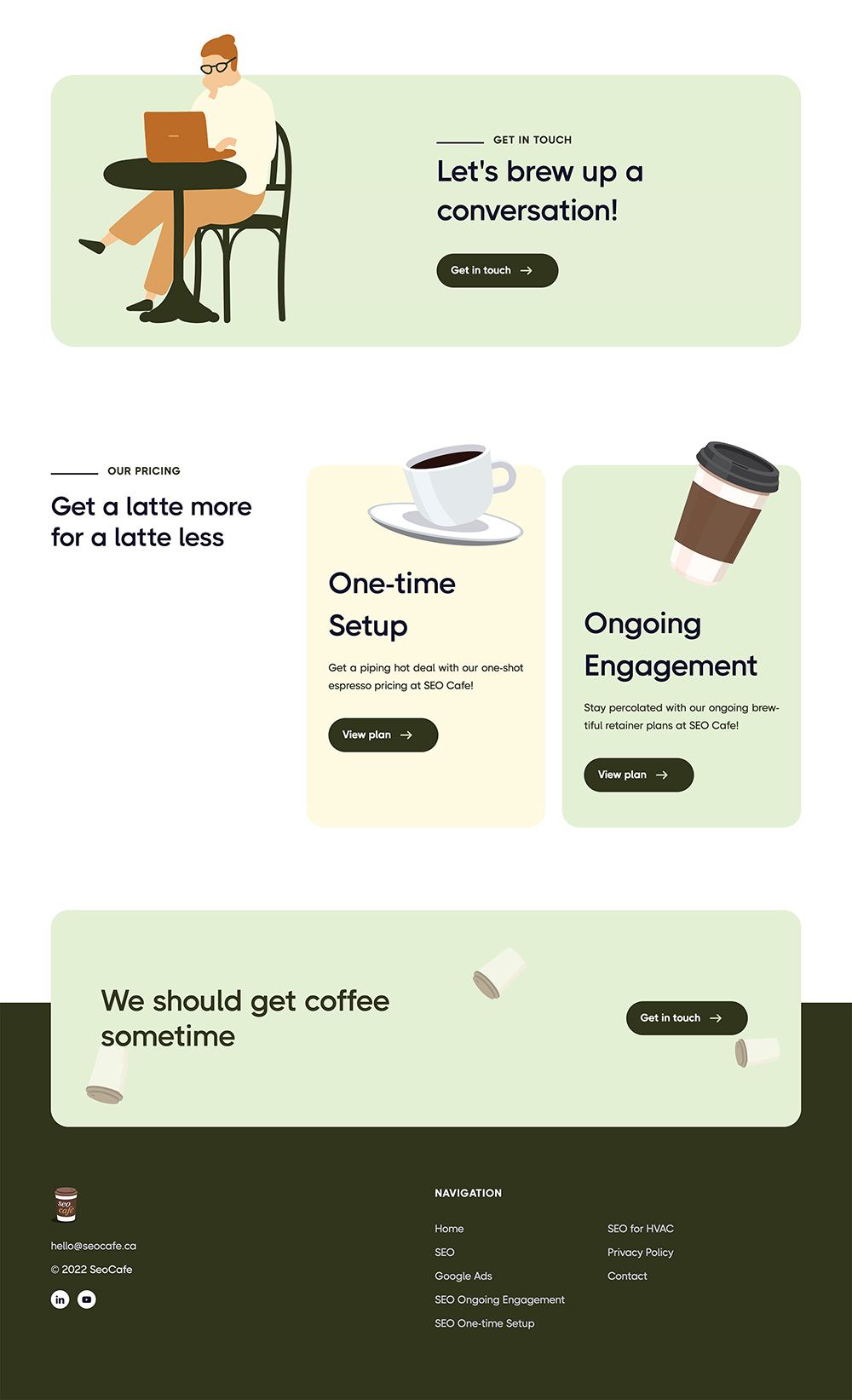 SEO Café launched their new website on schedule, receiving positive feedback from clients for its simplicity and aesthetic appeal. The playful branding and approachable design helped the agency stand out in a competitive market. The project demonstrated the power of combining minimalistic design with clear storytelling to make complex topics more engaging.