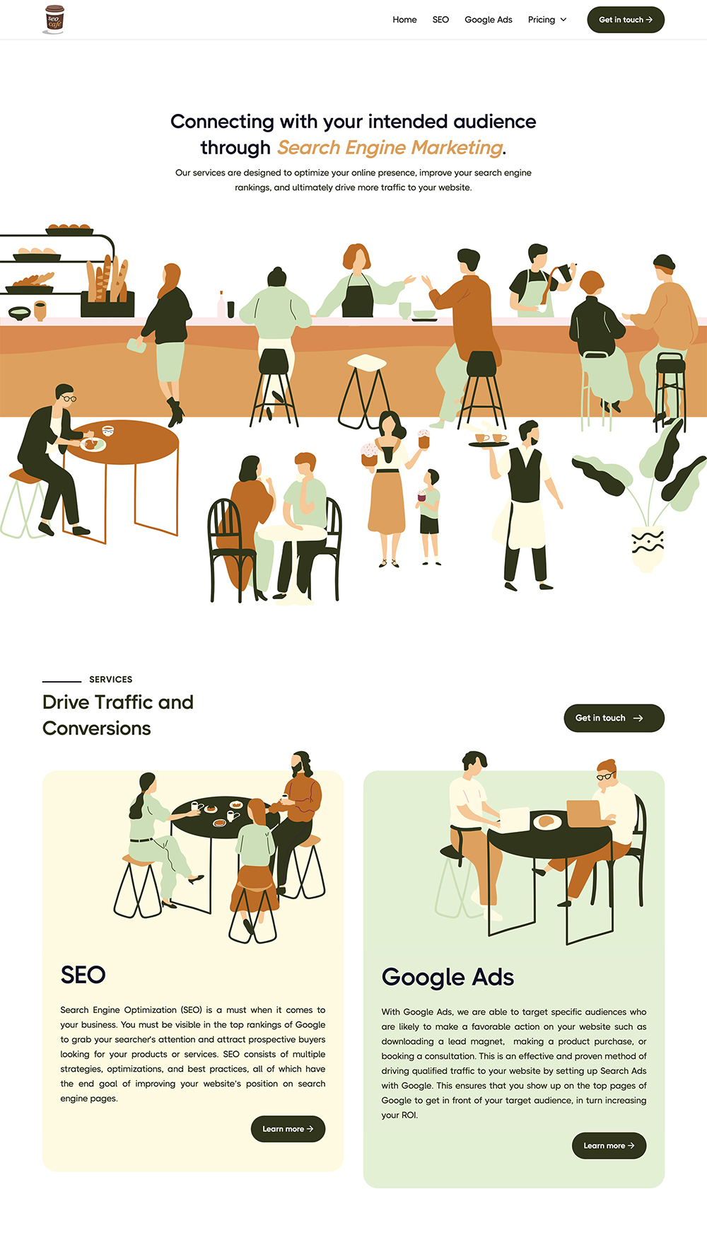 SEO Café launched their new website on schedule, receiving positive feedback from clients for its simplicity and aesthetic appeal. The playful branding and approachable design helped the agency stand out in a competitive market. The project demonstrated the power of combining minimalistic design with clear storytelling to make complex topics more engaging.